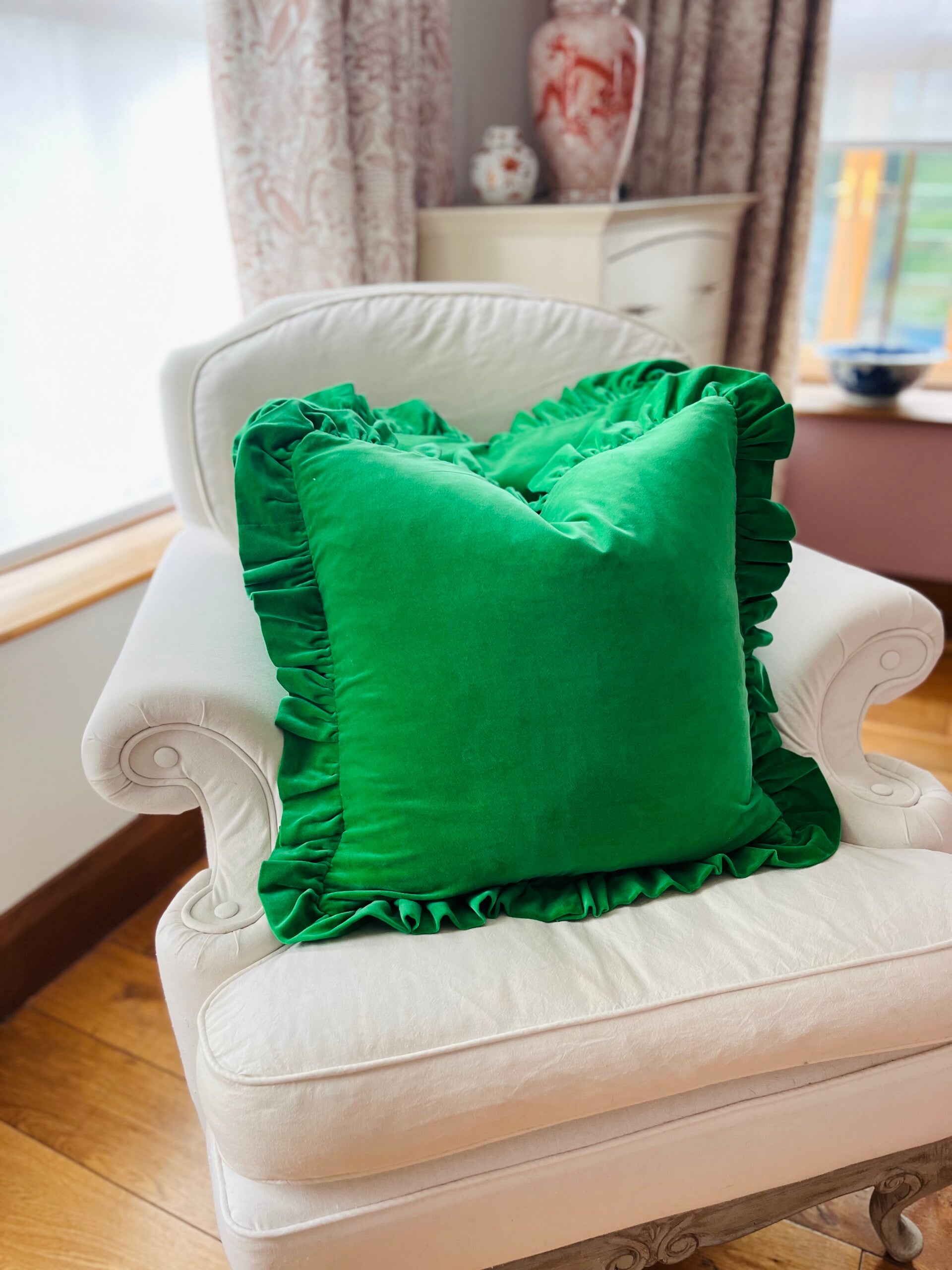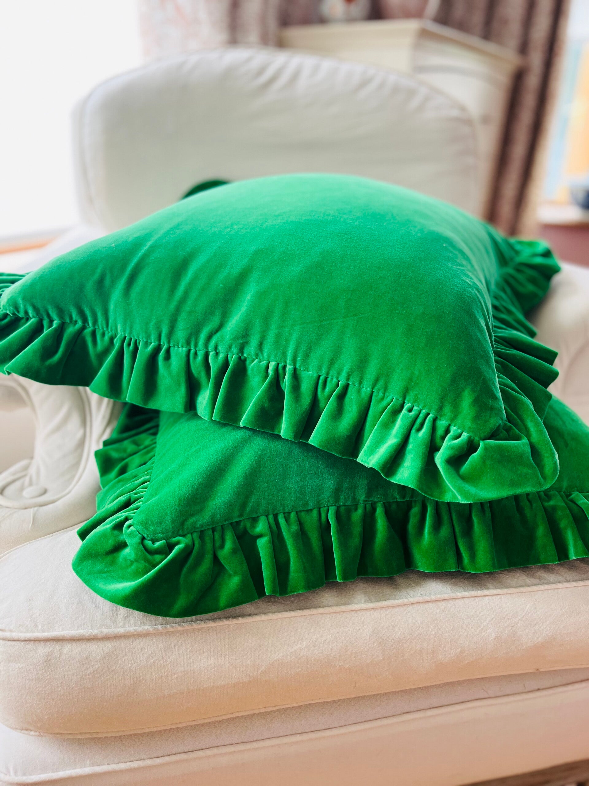 This gorgeous cushion is handmade with emerald green velvet fabric with frilled edge around.